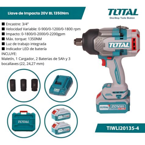 Total Llave De Impacto 20v Bl 1350nm Industrial Tiwli20135-4 (maletin, Cargador Y 2 Baterias 5.0ah)