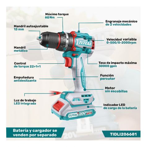 Total Taladro Percutor Inalambrico 20v Bl 2000 Rpm Industrial Tidli206021